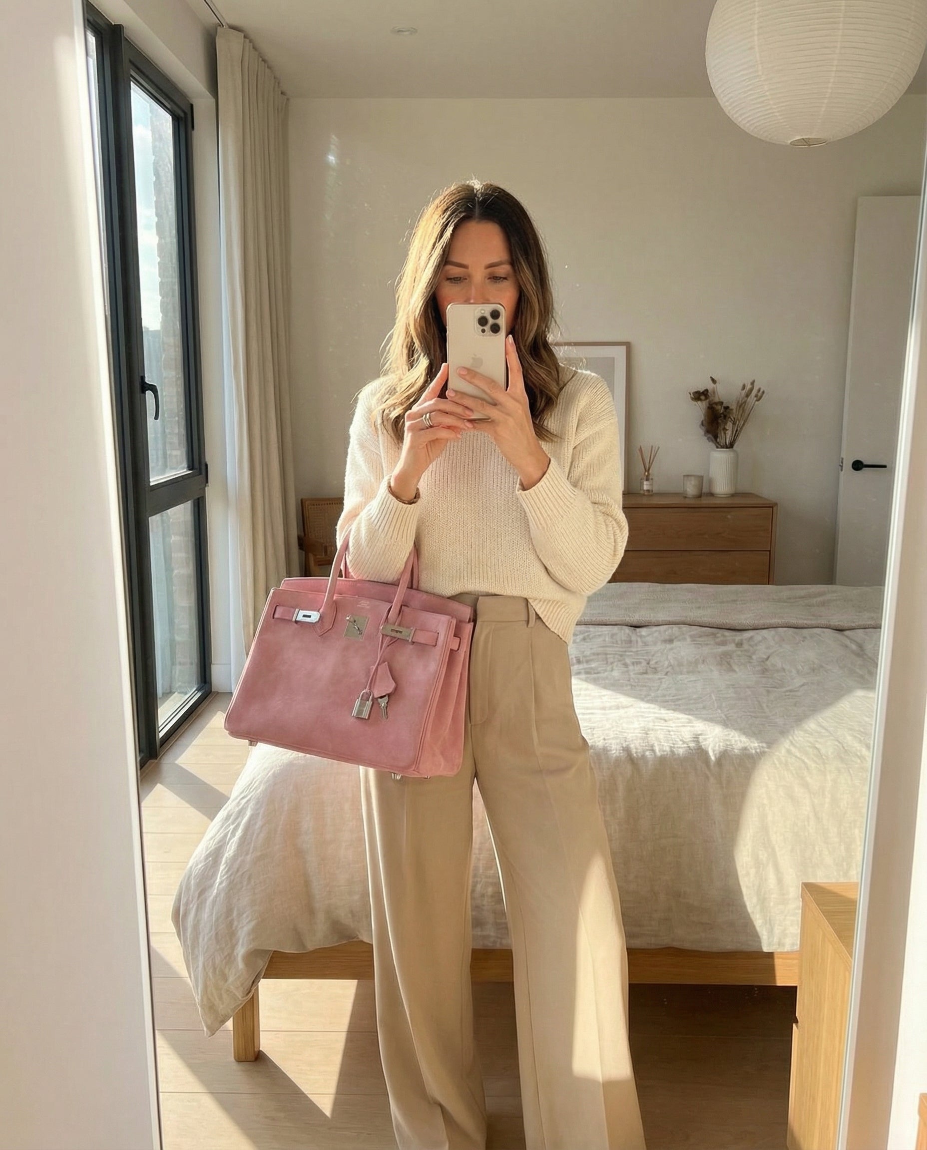 Hand-sewn using traditional saddle stitching with tonal pink thread for a seamless, refined finish.